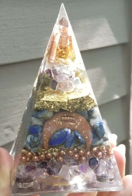 Medium tall Phi Ratio Pyramid with a variation of 3 types of crystals (picked by you, limited to inventory; choose these in the "Crystals" section) and 1-4 copper wrapped clear quartz points