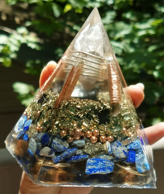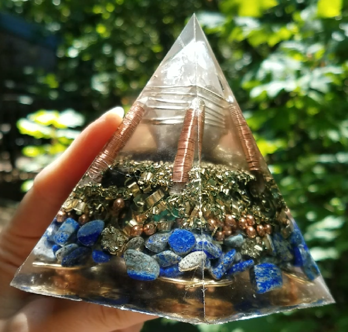 Extra Large 5-sided Phi Ratio Pyramid with a variation of 4 types of crystals (picked by you, limited to inventory; choose these in the "Crystals" section) and 1-6 copper wrapped clear quartz points