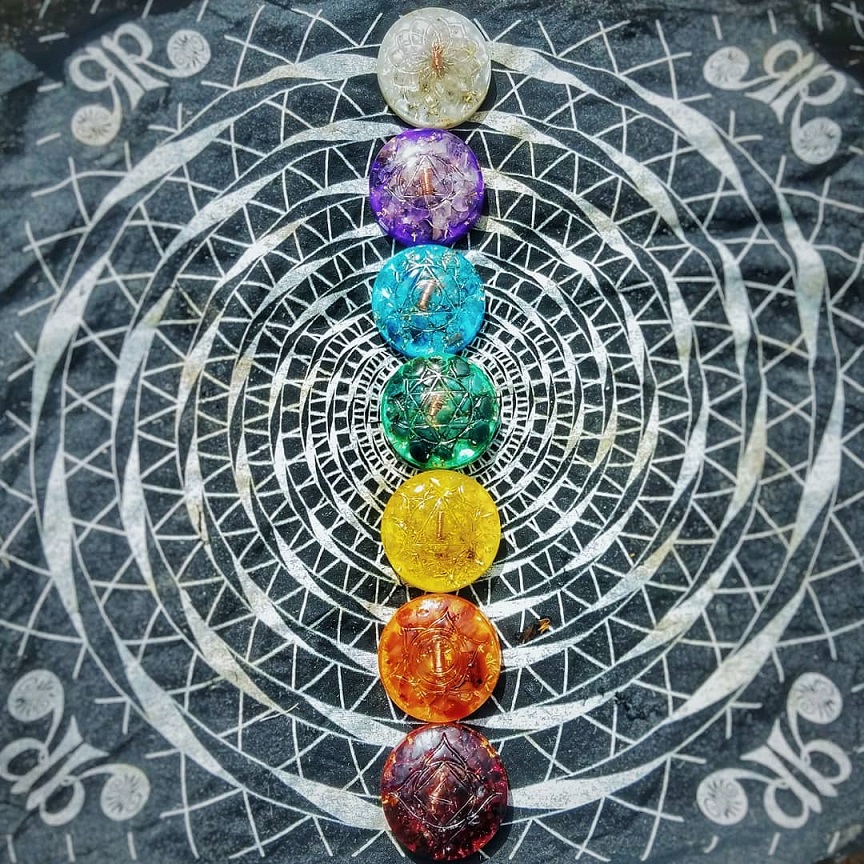 Set of 7 orgone Chakra pieces, each contains 1 copper wrapped Clear Quartz point & corresponding Chakra Crystal + Colored Mica